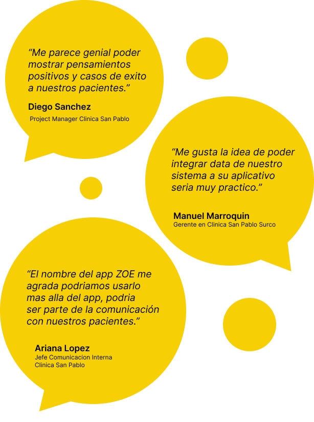 Realizamos entrevistas a seis usuarios, algunos de ellos de la clinica san pablo y ademas tambien clientes de los principales clinicas nacionales. Los resultados obtenidos nos ayudaron a conocer y entender mejor el entorno, la competencia y el camino que tienen nuestros usuarios.