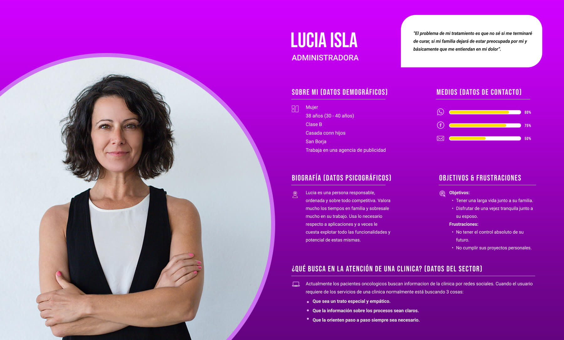 Con las herramientas y los conocimientos descubiertos a partir de mi investigación, creé una persona que representa mejor el grupo de usuarios de esta función. Destaqué los objetivos, las frustraciones, las motivaciones y los canales de comunicación preferidos de esta persona.