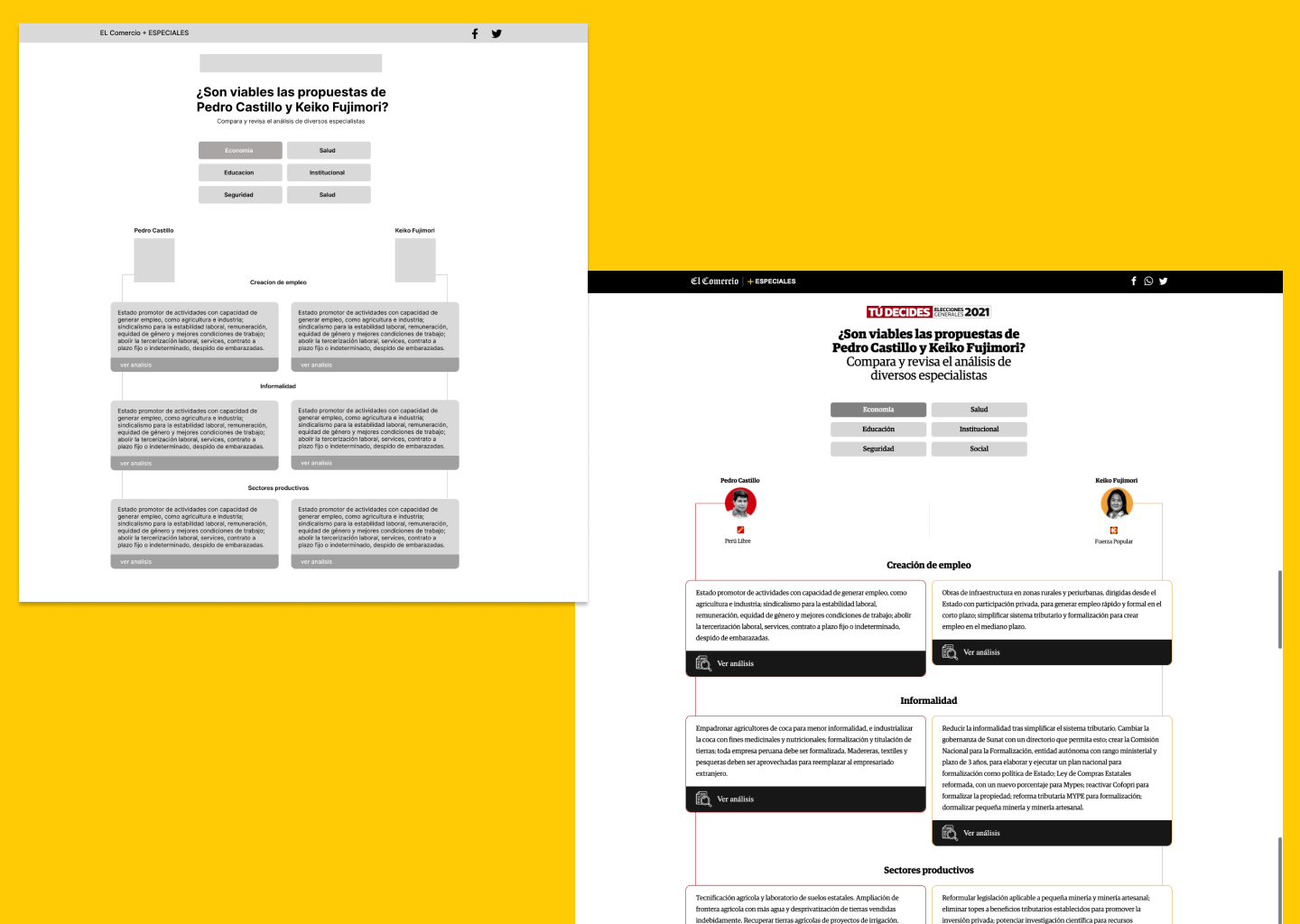 En el contexto de las elecciones presidenciales de Perú en el año 2021, se desarrolló una landing page interactiva que tenía como objetivo proporcionar a los votantes una comparativa detallada y objetiva de los planes de gobierno presentados por los candidatos Pedro Castillo y Keiko Fujimori. El propósito fundamental de esta plataforma fue empoderar a los ciudadanos con información clara y concisa sobre las propuestas en los sectores clave de la economía, educación, seguridad y salud, para que pudieran tomar decisiones informadas y fundamentadas durante el proceso electoral.