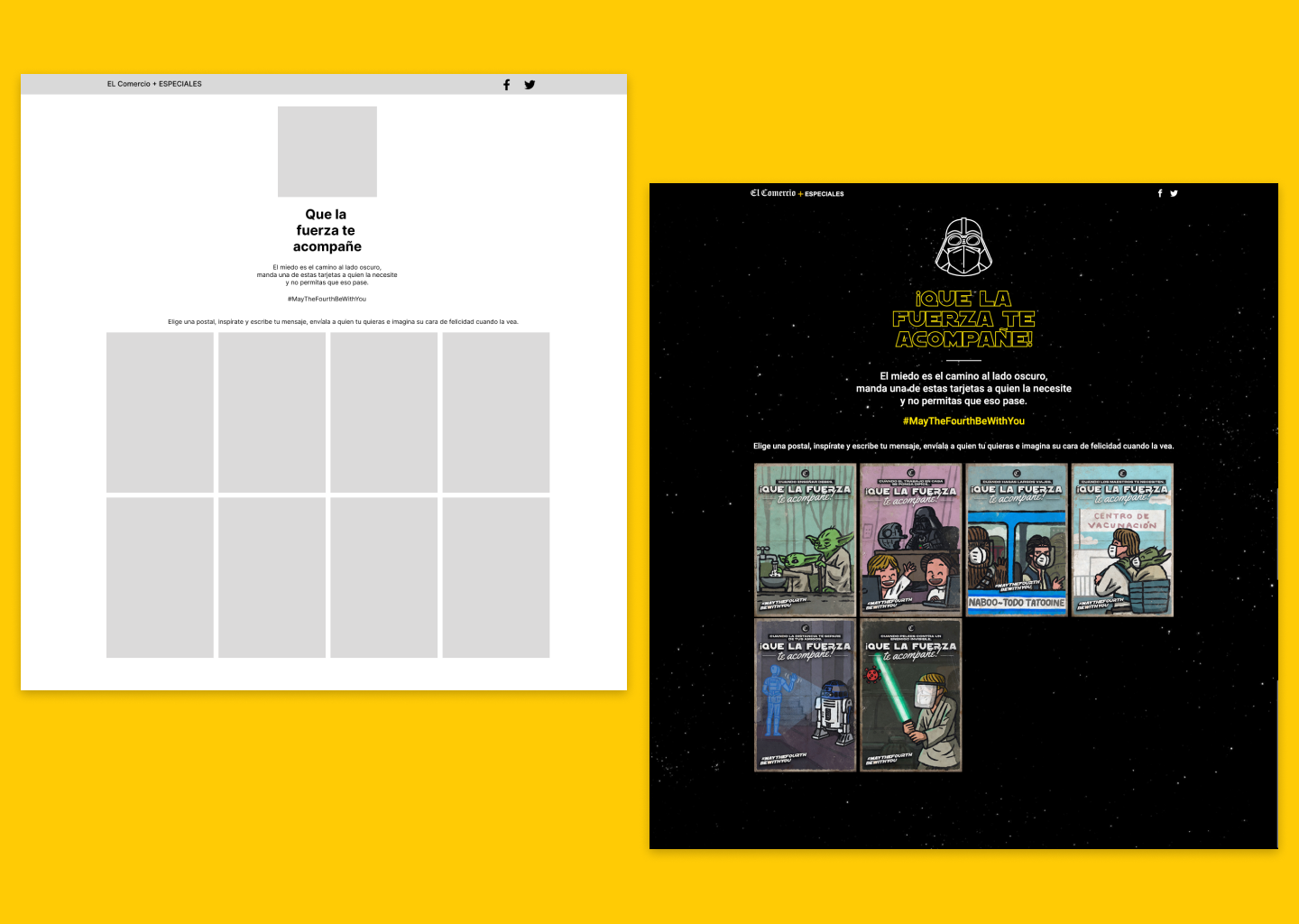 El proyecto consistió en el diseño y desarrollo de una landing page interactiva que permitiera a los usuarios enviar tarjetas virtuales con dedicatorias inspiradas en el universo de Star Wars en ocasión del "Día de la Fuerza". El objetivo principal era proporcionar una experiencia atractiva y lúdica que permitiera a los usuarios expresar sus saludos y buenos deseos de una manera única, al tiempo que fomentaba la participación y la viralidad a través del fácil intercambio de las tarjetas en redes sociales.