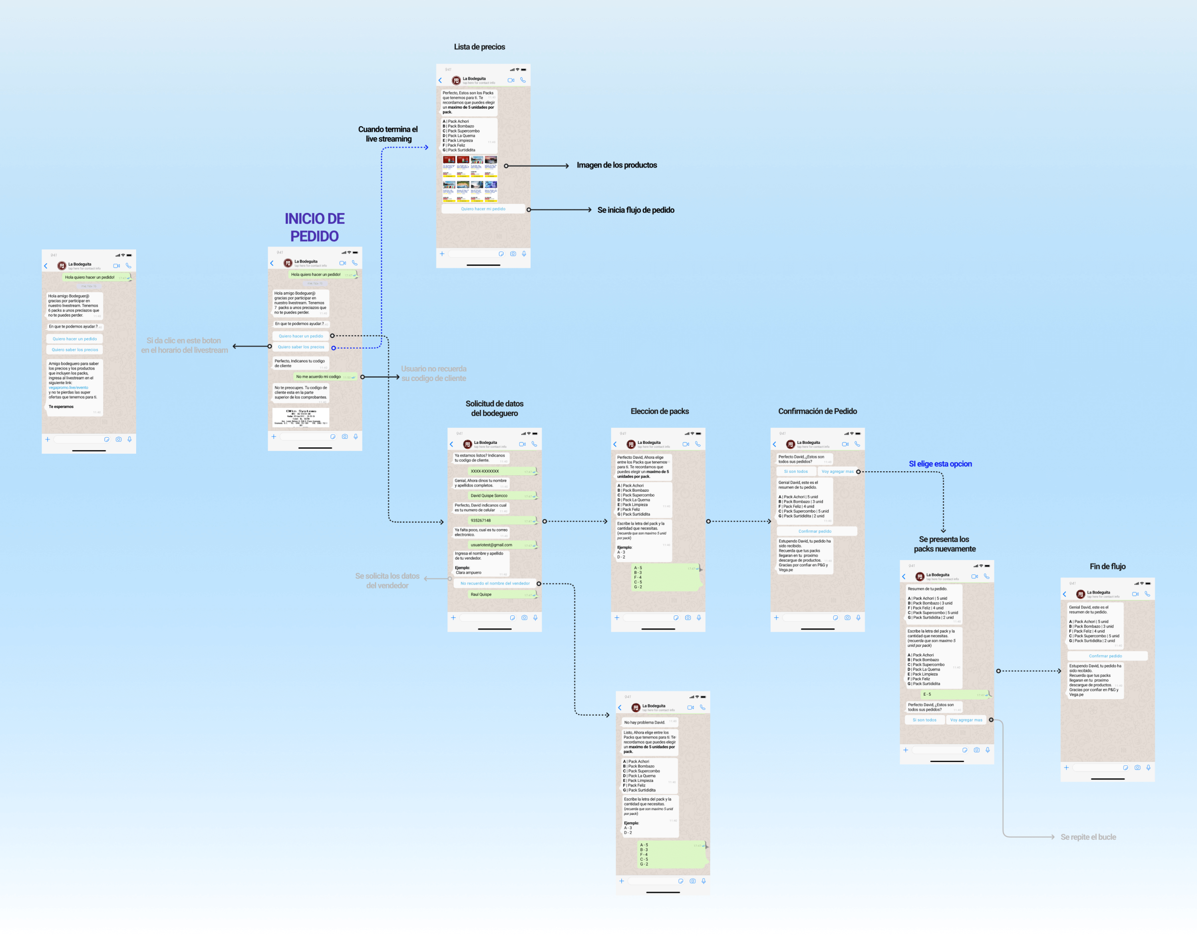 Diseño Centrado en el Usuario: Me aseguré de que el flujo del chatbot fuera intuitivo y estuviera diseñado de manera que se adaptara a las necesidades y la mentalidad de los clientes bodegueros.